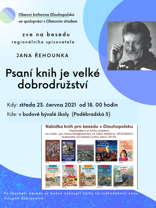 Obecní knihovna ve spolupráci s Obecním úřadem zve na besedu s regionálním spisovatelem Janem Řehounkem. Těšíme se na vaši návštěvu!