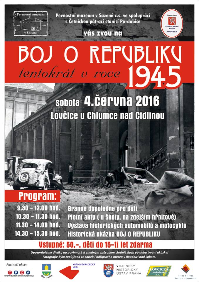 Pevnostní muzeum v Sazené z. s. ve spolupráci s Četnickou pátrací stanicí Pardubice vás zvou v sobotu 4. června 2016 do obce Lovčice, kde na návsi proběhne Boj o republiku tentokrát v roce 1945.
