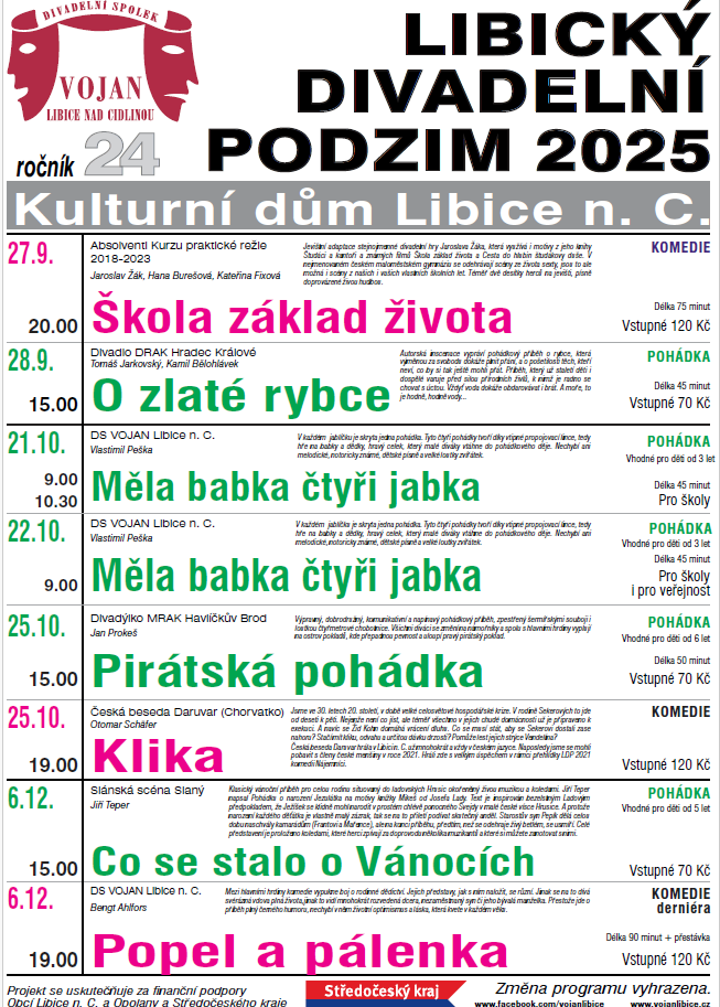 Těšíme se na vás tuto sobotu a neděli v kulturním domě v Libici nad Cidlinou. Více informací najdete na webových stránkách divadelního spolku Vojan: dsvojan.cz