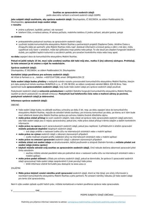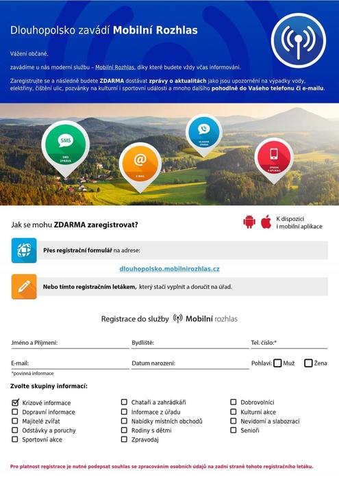 spustili jsme pro vás službu Mobilní Rozhlas, díky které s vámi nyní můžeme komunikovat moderně a efektivně. Občané, kteří se do Mobilního Rozhlasu zaregistrují, od nás budou dostávat důležité informace o dění v obci Dlouhopolsko, a to prostřednictvím SMS, e-mailů nebo zpráv do aplikace.