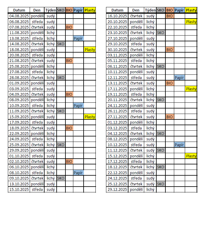 Do 22.12. 2025 bude všem do poštovní schránky doručen vytištěný harmonogram se svozy.